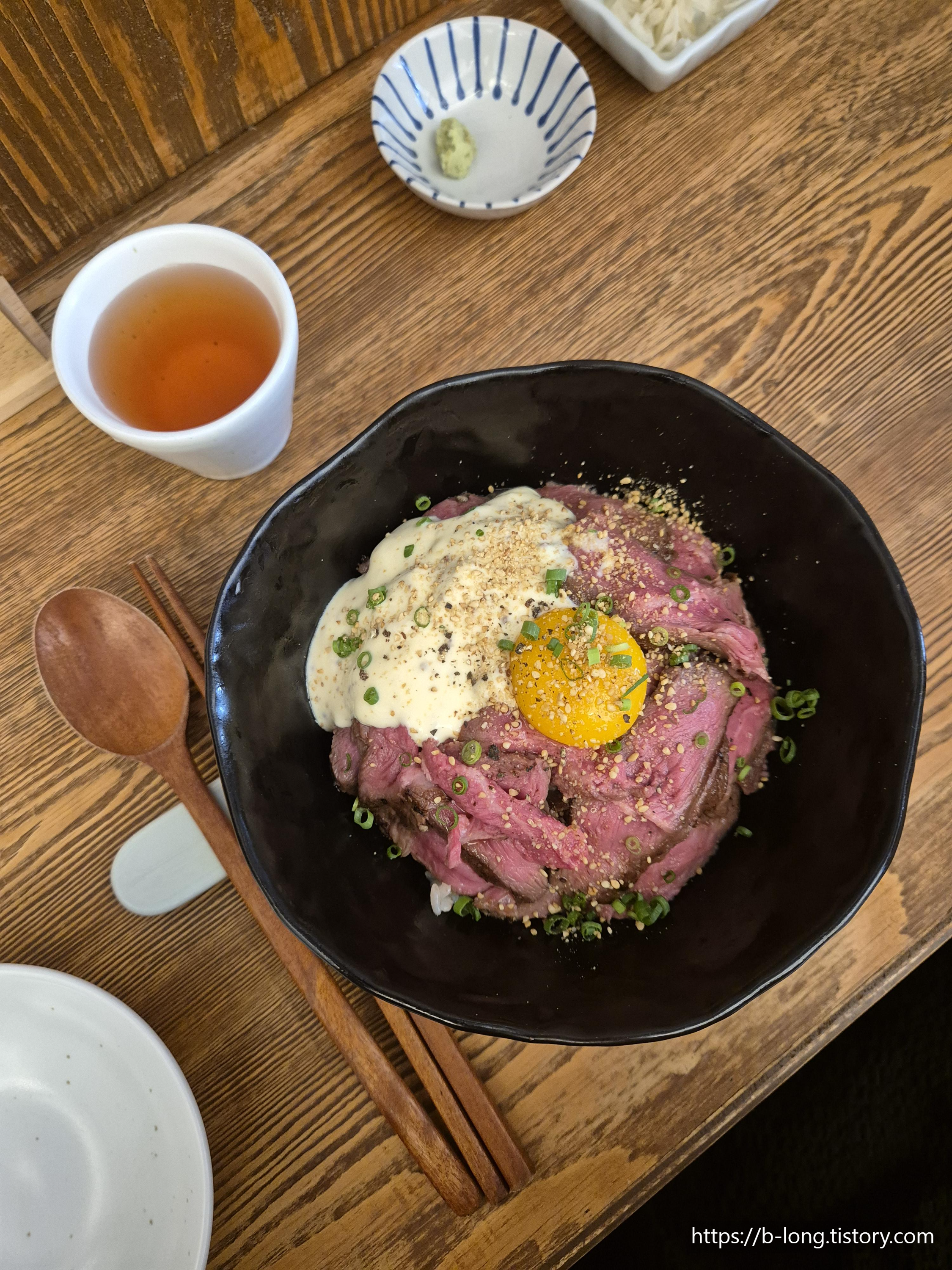 덮밥 위에 올라간 계란 노른자와 소스 그리고 고추냉이를 곁들여 먹으면 조합이 좋은 메뉴예요